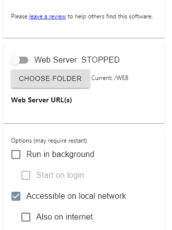 우선 웹서버를 끄고, 아래 로컬 네트워크에서 접속 가능에 체크를 한 후, 다시 웹서버를 작동시키면 됩니다.