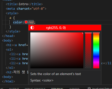 비주얼 스튜디오 코드에서는 색상 위에 커서를 갖다대면 타이핑 하지 않아도 원하는 색상으로 변경이 가능합니다.