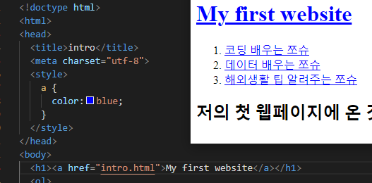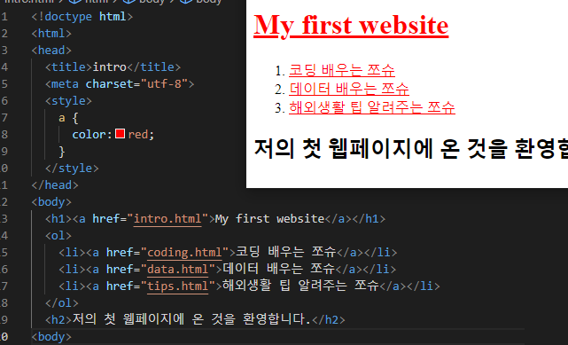CSS는 여러 가지를 한번에 변경할 때 유용하니, 하이퍼링크가 붙은 문자의 색상을 모두 빨강으로 변경해 봅시다.