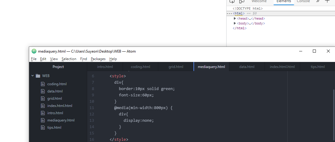 그러면 신기하게도 화면을 800px보다 크게 만들면 위처럼 화면에서 아무것도 안보이는 상태로 변합니다.