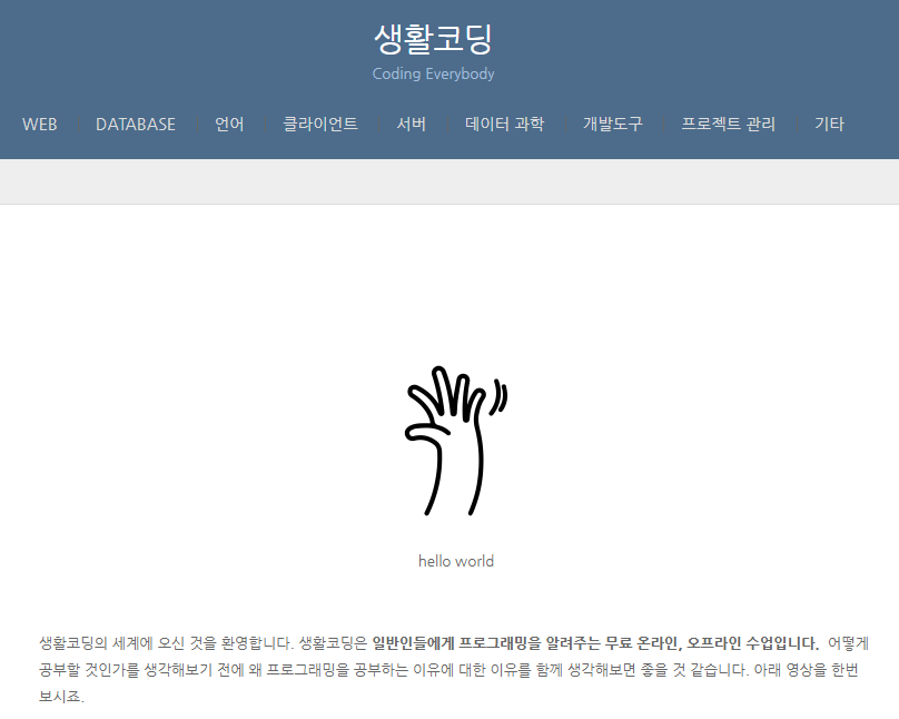 hello world 생활코딩의 세계에 오신 것을 환영합니다. 생활코딩은 일반인들에게 프로그래밍을 알려주는 무료 온라인, 오프라인 수업입니다. 어떻게 공부할 것인가를 생각해보기 전에 왜 프로그