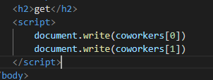 document.write로 꺼내봅시다. coworkers 배열안의 첫번째 아이템! 컴퓨터는 숫자를 0부터 세는거 아시나요?