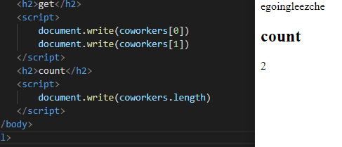 바로 length를 찾을 수 있는데요. 이렇게 document.write(coworkers.length) 를 이용하면 됩니다.