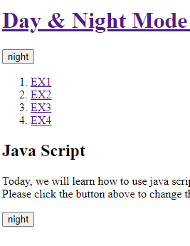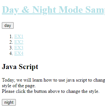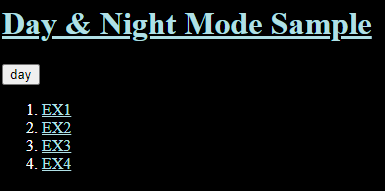 day 상태에서 아래의 day를 누르거나, night 상태에서 아래 night 를 누르면 정 반대의 상황이 나오곤 합니다. 왜냐면 아래의 버튼은 배경색과 글자색만 바꿀 뿐, 하이퍼링크의 색상은 변경되지 않기 때문입니다.