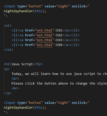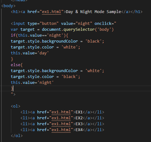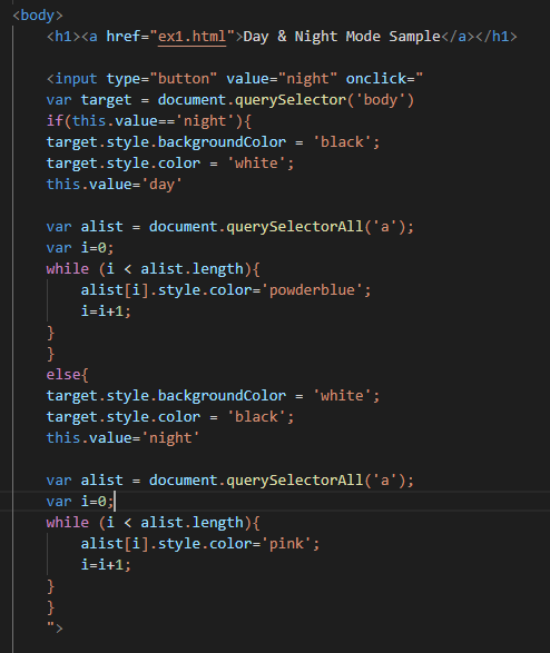 night버튼을 클릭하게 되면 i는 alist의 전체 개수가 되기 전까지 계속 증가하면서 모든 하이퍼링크의 색을 powderblue로 바꿉니다. day모드를 클릭하게되면, pink로 색상이 변경되구요.