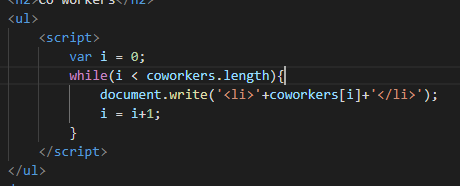 document.write 괄호 안 부분을 보면, li는 따옴표로 감싸고 coworkers[i]를 + 를 이용해서 묶어주었습니다.