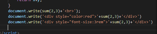 표시할 값은 x+y이기 때문에 document.write(x+y)를 넣어줍니다.