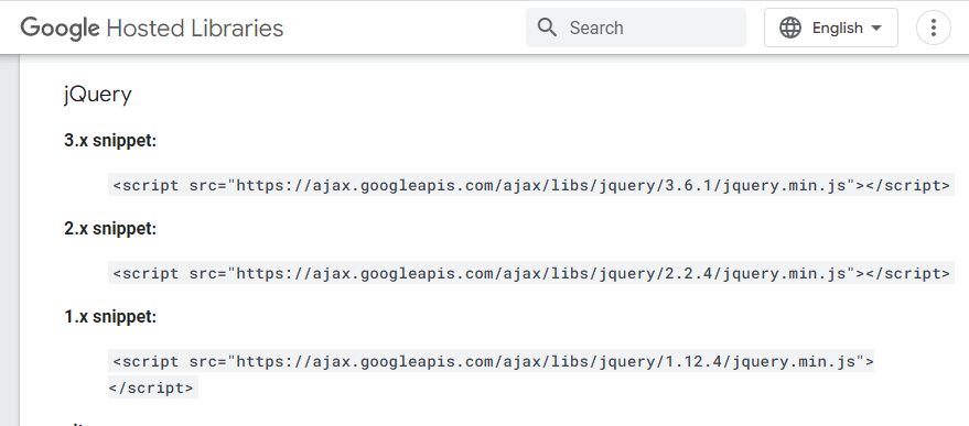 그럼 구글 cdn을 사용해봅시다! 3.x snippet을 복사한 후, html 파일에 추가해 주면 됩니다.