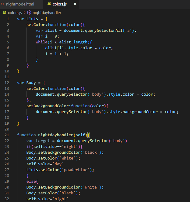 nightmode에 사용했던 페이지를 이용해서 객체를 만들고, 그 안에 함수를 넣어봅시다.