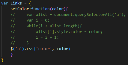 function 안의 내용을 모두 주석처리 (ctrl+/) 한 후에 $('a').css('color',color)를 넣어줍니다.