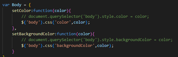 그리고 제가 실수했던 부분인데, Body.setBackgroundColor('color') 처럼 괄호 안에 '색깔' 을 넣어야지 예전 함수 그대로 = '색깔' 로 그냥 두시면 안됩니다!