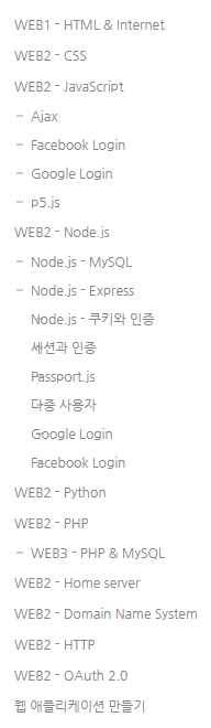 자 순서를 보면 우선 HTML과 인터넷에 대해 배운 후, CSS와 JavaScript, Node.js, Phyton, PHP 등등에 대해 배우네요.