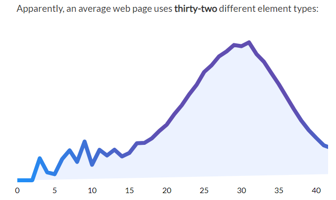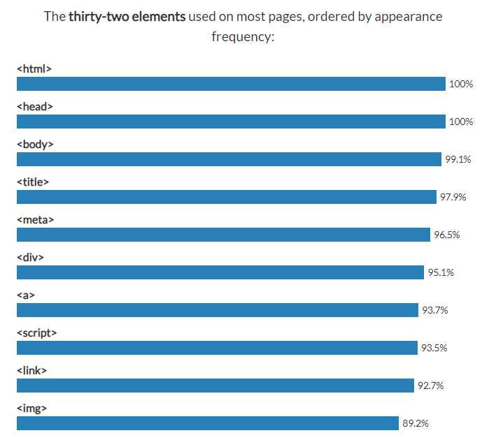 Apparently, an average web page uses thirty-two different element types: The thirty-two elements used on most pages, ordered by appearance frequency: