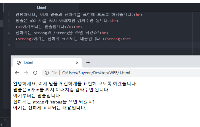 다만 웹페이지에서는 밑줄을 그으려면 <u>와 </u>로 밑줄 치고 싶은 부분을 감싸줘야 합니다.